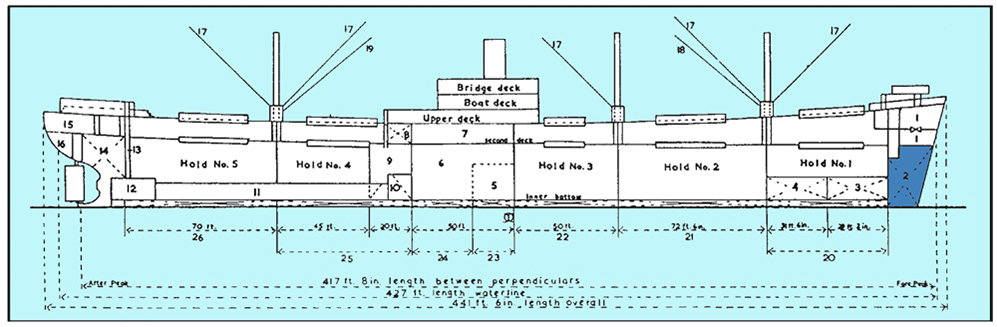 Liberty ship schematic drawing, from Sawyer, L. A., & Mitchell, W. H. (1970). The liberty ships: The history of the "emergency" type cargo ships constructed in the United States during World War II. Cambridge, Md: Cornell Maritime Press.
